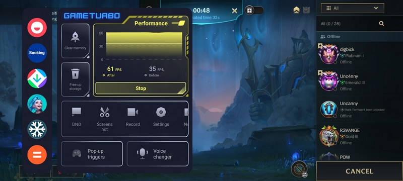 Kami berhasil mencapai FPS 60 (tidak bisa ditingkatkan karena menggunakan limitasi FPS) dan tidak mengalami fps drop sama sekali dengan tingkat grafisrata kanan. POCO F4 GT juga dilengkapi Game Turbo  untuk menjaga performa gaming menjadi sangat stabil.