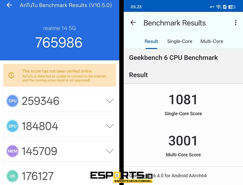 Sebelum melakukan pengujian dalam game, seperti biasa Tim Esports ID menggunakan AnTuTu dan GeekBench 6 untuk mendapatkan benchmark device ini. Hasilnya, cukup mengesankan. realme 14 5G mendapatkan skor AnTuTu 765.986, dengan rincian 259.346 (CPU), 184.804 (GPU), 145.709 (Memory) dan 176.127 (UX). Angka ini sesuai dengan klaim pihak realme dalam sesi peluncuran.