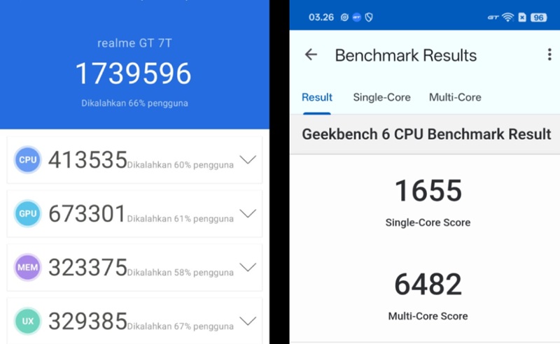 Sedangkan di GeekBench, realme GT 7T mencatat skor 1.655 untuk single-core dan 6.482 untuk multi-score.