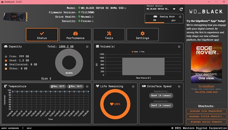 WD juga menyiapkan software yang diberi nama WD Black SSD Dashboard, pendukung untuk meningkatkan performanya. WD tak lupa menyematkan fitur gaming yang bisa meningkatkan performa. Disini juga bisa dilihat performa SSD seperti temperature dan sisa ruang penyimpanan serta update firmware.