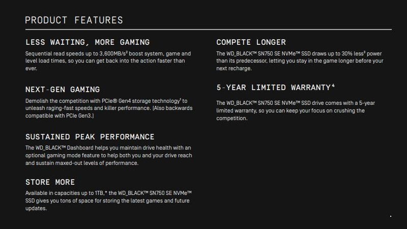 Seperti design SSD pada umumnya, WD Black SN750 SE NVMe sangat ramping dan ringan. SSD ini juga tersedia dalam tiga ukuran, yakni 250GB, 500GB dan 1TB dan diklaim memiliki kecepatan membaca (read) hingga 3.600MB/s dan menulis (write) up to 2.830MB/s. Kecepatan ini tentu membuat perfoma PC kalian meningkat tajam, terutama saat loading game-game yang berat.