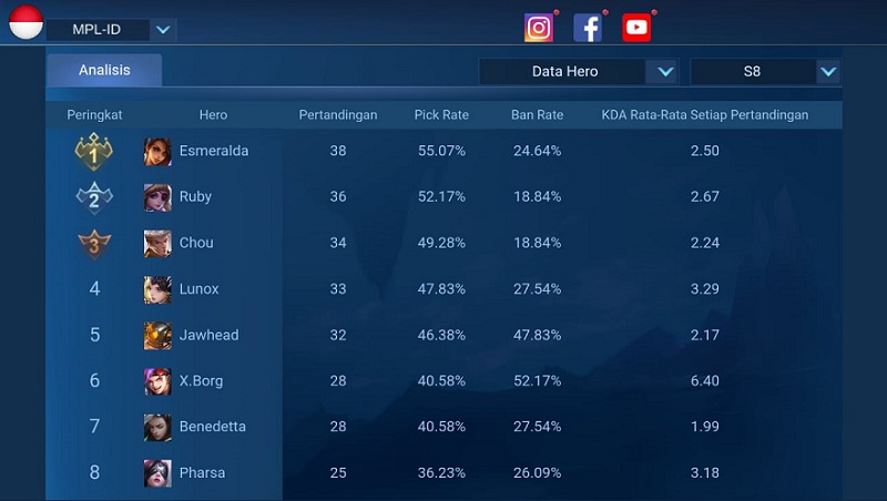 MPL Season 8 memasuki pekan ke-5, patch baru 1.6.10 juga datang membawa berbagai perubahan dalam gameplay. Meta di MPL Season 8 masih berkutat dengan jungler assassin, beberapa tim mengandalkan core marksman, mage sampai fighter.
