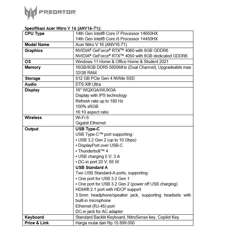 Andreas Lesmana, Gaming Notebook Product Manager Acer Indonesia, menyatakan, “Kami di Acer Indonesia selalu mengedepankan kebutuhan pelanggan yang terus berkembang dan mengikuti perkembangan industri gaming itu sendiri. Untuk itu melalui lini Predator Gaming Indonesia, kami menghadirkan laptop gaming seri Nitro yakni V 16 yang bisa digunakan untuk kebutuhan bermain gim berat, hingga produktivitas dan kreativitas untuk konten kreator. Layar 16 inci yang dihadirkan pada jajaran laptop Nitro ini juga diharapkan bisa lebih memuaskan visual gamer, maupun saat digunakan untuk kebutuhan sehari-hari lainnya.”