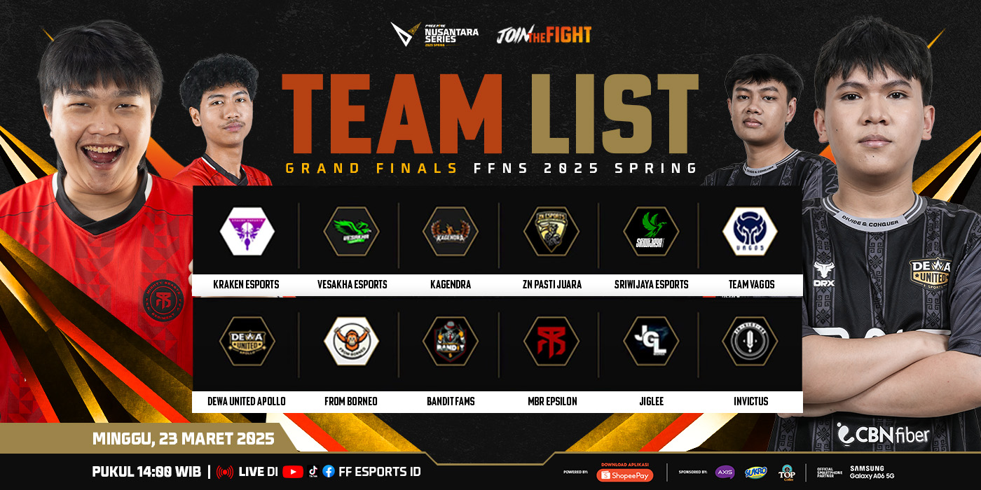 Pertandingan puncak Free Fire Nusantara Series (FFNS) 2025 Spring akan segera hadir dengan mempertemukan 12 tim terbaik dari seluruh Indonesia dalam duel panas di di Medan, Sumatra utara, pada pada 22-23 Maret 2025. Laga ini akan menjadi pertarungan nama-nama besar di kancah esports Free Fire Indonesia untuk mendapatkan hadiah terbesar dari prize pool senilai Rp700 juta dan tiket terakhir menuju Free Fire World Series Southeast Asia (FFWS SEA) 2025 Spring.