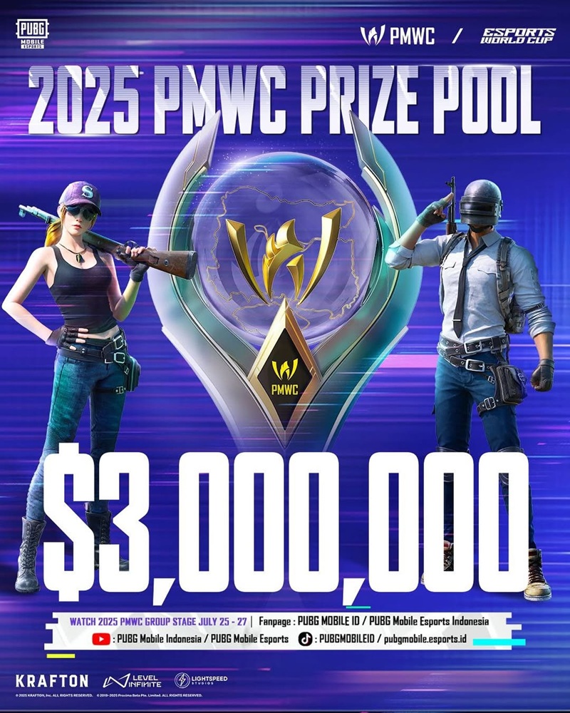 Turnamen internasional PUBG MOBILE bertajuk PUBG MOBILE World Cup (PMWC) 2025 siap digelar di Riyadh, Arab Saudi, sebagai bagian dari rangkaian EWC 2025. Kompetisi ini berlangsung di sela-sela PMGO 2025 dan PMGC 2025, menghadirkan total 24 tim terbaik dunia yang akan bertarung memperebutkan hadiah senilai USD3.000.000 (Rp48,9 miliar) dan 1.000 EWC Club Points, membuka peluang menuju bonus EWC sebesar USD27 juta (Rp440 miliar).