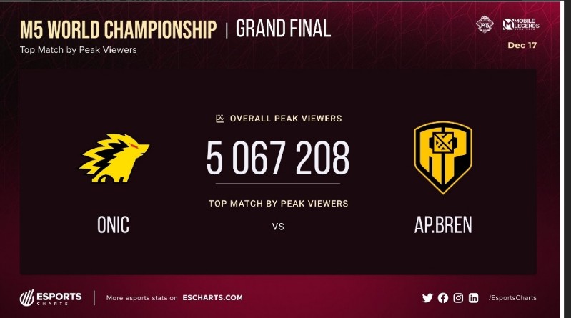 Kemenangan AP Bren vs ONIC juga pecahkan rekor PCU tertinggi sepanjang sejarah MLBB, menembus angka 5,6 juta viewers berdasarkan data Esports Charts. Penonton offline juga membludak memadati Rizal Memorial Coliseum, lokasi final M5 dengan 6000 lebih penonton menyaksikan tim tuan rumah berjaya.
