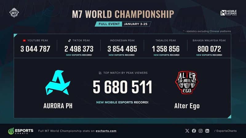 M7 World Championship resmi mencetak sejarah sebagai turnamen mobile esports paling banyak ditonton sepanjang masa. Berdasarkan data dari Esports Charts, Grand Final antara Aurora Gaming Philippines (RORA) vs Alter Ego (AE) mencapai lebih dari 5,68 juta Peak Concurrent Viewers (PCV), memecahkan rekor global dua kali sepanjang turnamen berlangsung.