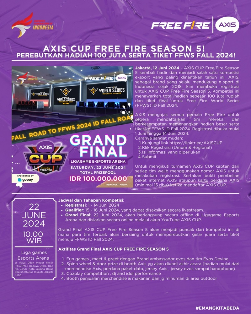 Untuk informasi lebih lanjut dan update terbaru, ikuti akun Instagram AXIS CUP di Instagram. Mari bergabung dan tunjukkan kemampuan terbaikmu di AXIS CUP Free Fire Season 5! #emangkitabeda
