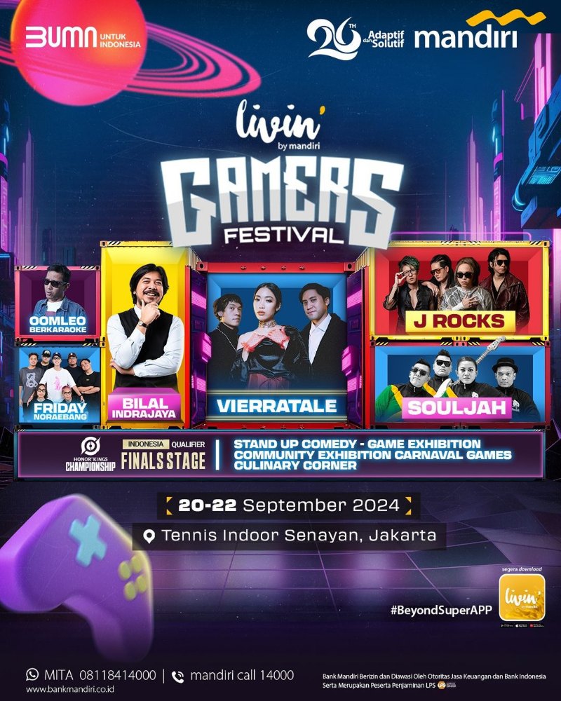 Menyambut semangat perayaan HUT ke-26, Bank Mandiri menggelar Livin’ Gamers Festival 2024, sebuah ajang yang ditujukan bagi para pecinta gim dan komunitas e-sports di Indonesia. Berkolaborasi dengan salah satu game developer terkemuka di Indonesia, Level Infinite, event ini akan diadakan pada tanggal 20-22 September 2024 di Tennis Indoor Senayan, Jakarta, dengan mengusung tema “Carnival of Kings”.