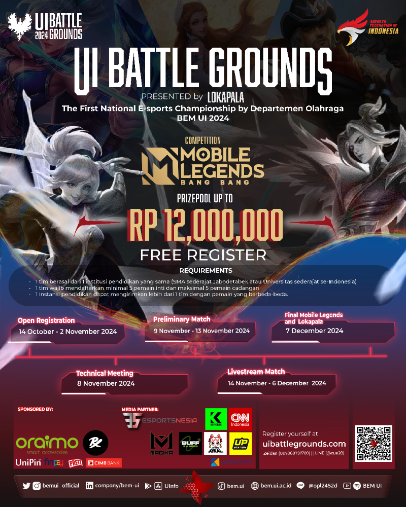 Badan Eksekutif Mahasiswa (BEM) Universitas Indonesia berkolaborasi dengan 8 Satu Ruang Kreasi kembali menghadirkan UI Battlegrounds 2024! Mengusung tagline "unleash the prodigy within you", Acara ini ditujukan untuk mahasiswa dan pelajar menunjukan kemampuan mereka di empat cabang kompetisi esports, yaitu Mobile Legends, PUBG-M, Valorant dan Lokapala.