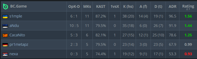 Tak diragukan lagi, s1mple menjadi pemain paling menonjol di laga ini. Ia mencatatkan 38 kill, hanya 19 death, dan 96 ADR (Average Damage per Round). Statistik tersebut menegaskan peran krusialnya sebagai pemimpin tim dan pembeda dalam duel-duel penting.