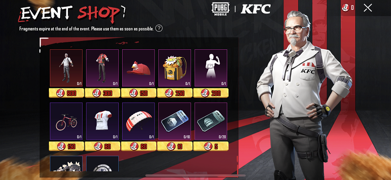 Dengan melakukan 10 putaran pertama, pemain juga akan mendapatkan hadiah berupa KFC Colonel Token. Tokenyang telah pemain kumpulkan dapat ditukarkan di Event Shop dengan setelan dan aksesoris bertema KFC dengan rincian berikut: