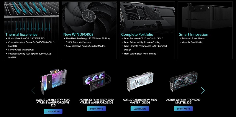 Dalam menyeimbangkan performa gaming tingkat lanjut dan efisiensi termal pada varian pendingin udara, GIGABYTE meningkatkan solusi pendinginan WINDFORCE dengan desain Kipas Hawk yang baru untuk meminimalkan turbulensi dan tingkat kebisingan, meningkatkan aliran udara sebesar 12,5%, dan memberikan peningkatan tekanan udara hingga 53,6%. Gel termal konduktif tingkat server dapat menempel sempurna pada permukaan berbagai komponen tanpa bergeser untuk penggunaan jangka panjang. Varian AORUS MASTER premium melangkah lebih jauh, menampilkan Screen Cooling Plus dengan kipas tambahan untuk meningkatkan aliran udara dan RTX™ 5090 MASTER dilengkapi dengan heat pipe Superconducting dengan teknologi section sintering untuk meningkatkan distribusi panas.