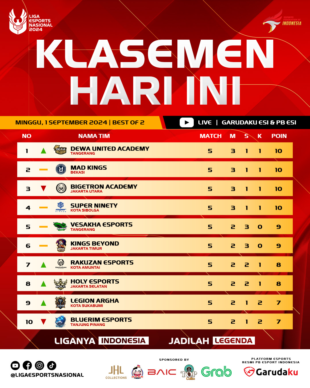 Dengan hasil-hasil ini, klasemen sementara mengalami pergeseran penting. Dewa United Academy dari Tangerang berhasil mengambil alih puncak klasemen dari Bigetron Academy, meskipun empat tim teratas yaitu Dewa United Academy, Bigetron Academy, Super Ninety, dan Mad Kings memiliki poin yang sama, yaitu 10 poin. Posisi mereka hanya dibedakan oleh selisih poin kill, menunjukkan betapa ketat dan seimbangnya persaingan di Liga 2 Esports Nasional 2024.