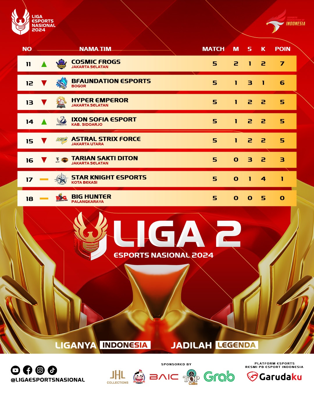 Hari kelima ini menjadi titik penting dalam perjalanan kompetisi, dengan Rakuzan Esports dari Kota Amuntai membuka kemenangan mereka atas Bluerim Esports dari Tanjung Pinang dengan skor 2-0. Kemudian, Legion Argha dari Sukabumi berhasil menumbangkan Big Hunter dari Palangkaraya, juga dengan skor 2-0, mengukuhkan dominasi mereka di lapangan.