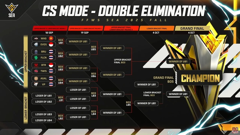 Dua tim Indonesia, EVOS Divine dan Bigetron by Vitality, berhasil mengamankan tempat di babak Double Elimination mode Clash Squad (CS) dalam ajang FFWS SEA 2025 Fall. Pertandingan mode CS yang berlangsung pada 10–12 September 2025 menjadi panggung penentuan bagi tim-tim Asia Tenggara untuk melaju ke fase eliminasi ganda.
