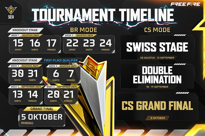 - Battle Royale (BR): Knockout berlangsung 15 Agustus–14 September, Grand Finals BR digelar 5 Oktober di Bangkok.