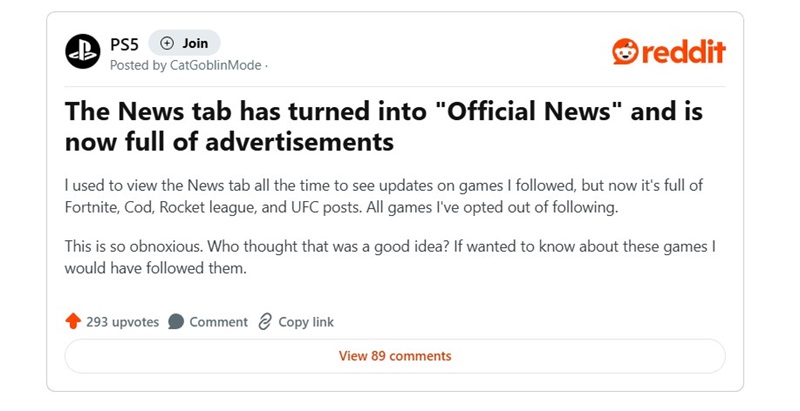 Beberapa pemain PlayStation 5 tidak senang dengan perubahan terbaru pada dashboard konsol, di mana tab News sebelumnya menjadi tab Official News. Masalahnya, tab baru ini dipenuhi dengan konten tentang game layanan langsung populer seperti Fortnite, Rocket League, dan Call of Duty. Menurut postingan media sosial CatGoblinMode, perubahan ini dianggap "mengganggu" karena pemain menerima berita dari judul-judul ini meskipun mereka tidak mengikuti game tersebut, membuat tab News menjadi kurang berguna.