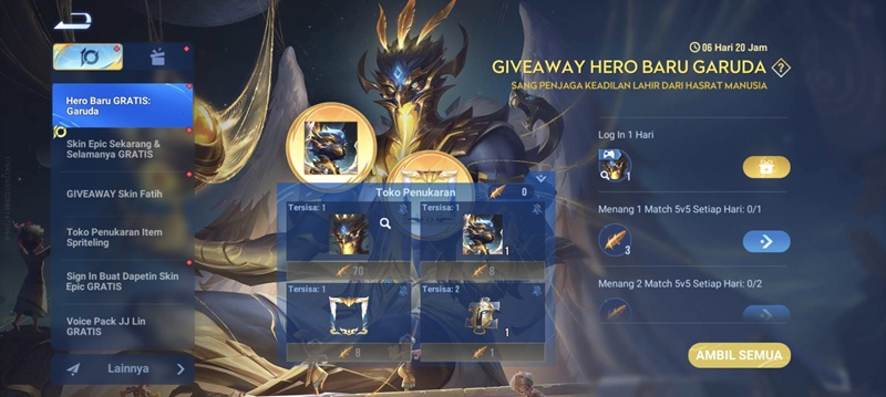 - Main 3 Match 5v5 Menggunakan Garuda: 15 Bulu Emas (maks. 3 klaim)