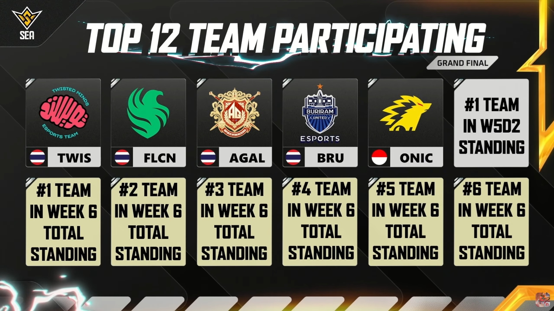 Hingga pekan keempat, empat tim asal Thailand telah mengamankan tempat di Grand Final: Twisted Minds (PHARAOH), Team Falcons, All Gamers Global, dan Buriram United Esports.