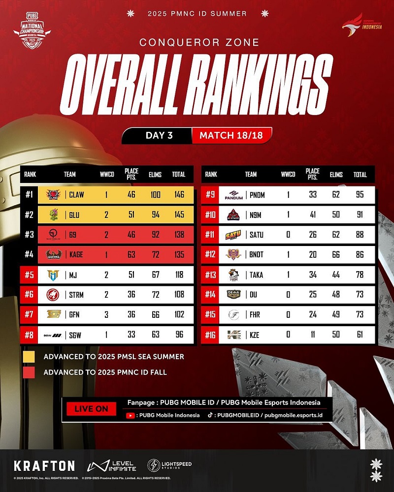 Dengan hasil ini, Claw Slayers dan GLU Squad bergabung dengan enam tim Indonesia lainnya yang telah lolos sebelumnya, yakni: