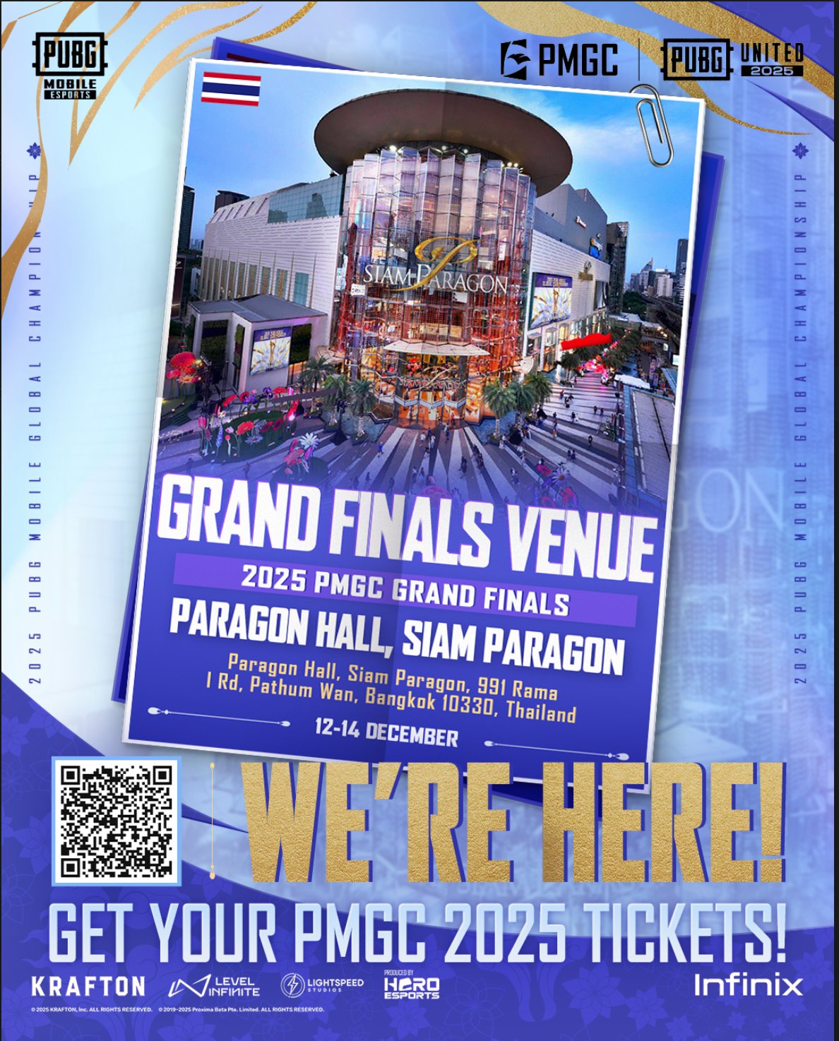 Grand Finals PMGC 2025 akan berlangsung pada 12–14 Desember 2025 di Siam Paragon, Bangkok, Thailand. Selama tiga hari, 16 tim akan bertarung dalam total 18 match (6 match per hari). Format pertandingan akan semakin menegangkan di hari terakhir dengan penerapan Smash Rule.
