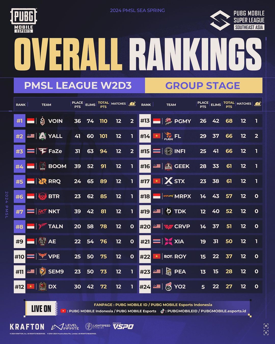 Babak Group Stage PMSL SEA Spring 2024 Week 2 telah usai. 3 hari penuh dengan ketegangan dari 24 tim yang terbagi dalam 3 group. Namun hanya 8 tim yang sudah memastikan diri lolos ke Super Sunday, 5 diantaranya yaitu tim dari Indonesia. VOIN, Yoodo Alliance, Faze, BOOM, RRQ, BTR, NKT,dan TALON adalah tim yang memastikan diri lolos ke Super Sunday . Sementara 3 tim Indonesia lainnya yaitu Alter Ego, Pigmy, dan MRPX akan berebut slot menuju Super Sunday di babak Last Chance.
