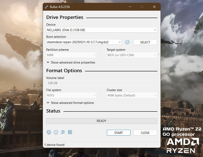 Langkah pertama adalah mengunduh aplikasi Rufus dari situs resminya. Buka Rufus, klik "Select", lalu pilih file reimage SteamOS yang sudah diekstrak tadi. Tekan "Start", kemudian klik "OK" untuk memulai proses, namun ingat, proses ini akan menghapus semua data di USB flash drive kamu.