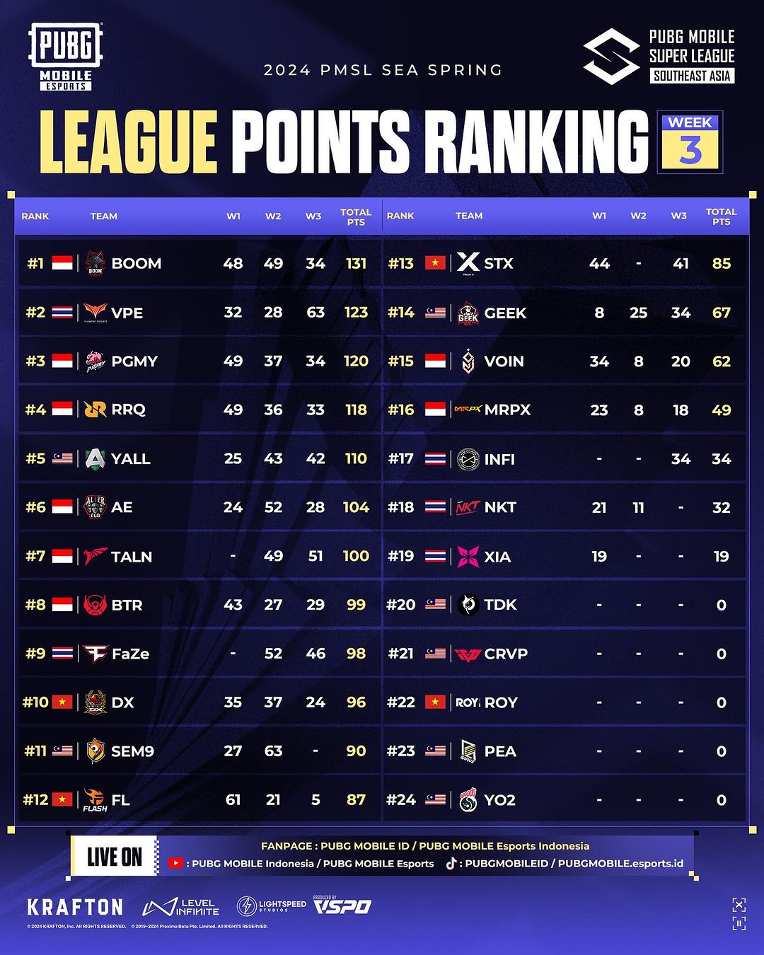 Dengan berakhirnya Super Sunday Week 3 maka berakhir sudah babak League Stage PMSL SEA Spring 2024. Sebanyak 16 tim PUBG Mobile terbaik yang sudah berjuang di League Stage akan bertanding di babak Grand Finals. Dari 16 tim yang lolos, delapan di antaranya berasal dari Indonesia. Lalu sisany tiga tim Malaysia, tiga tim Vietnam, dan dua dari Thailand. Indonesia menjadi negara dengan perwakilan tim terbanyak di babak Grand Finals. Dengan hal itu, peluang untuk menjuarai PMSL 2024 bagi tim asal Indonesia sangatlah mungkin.