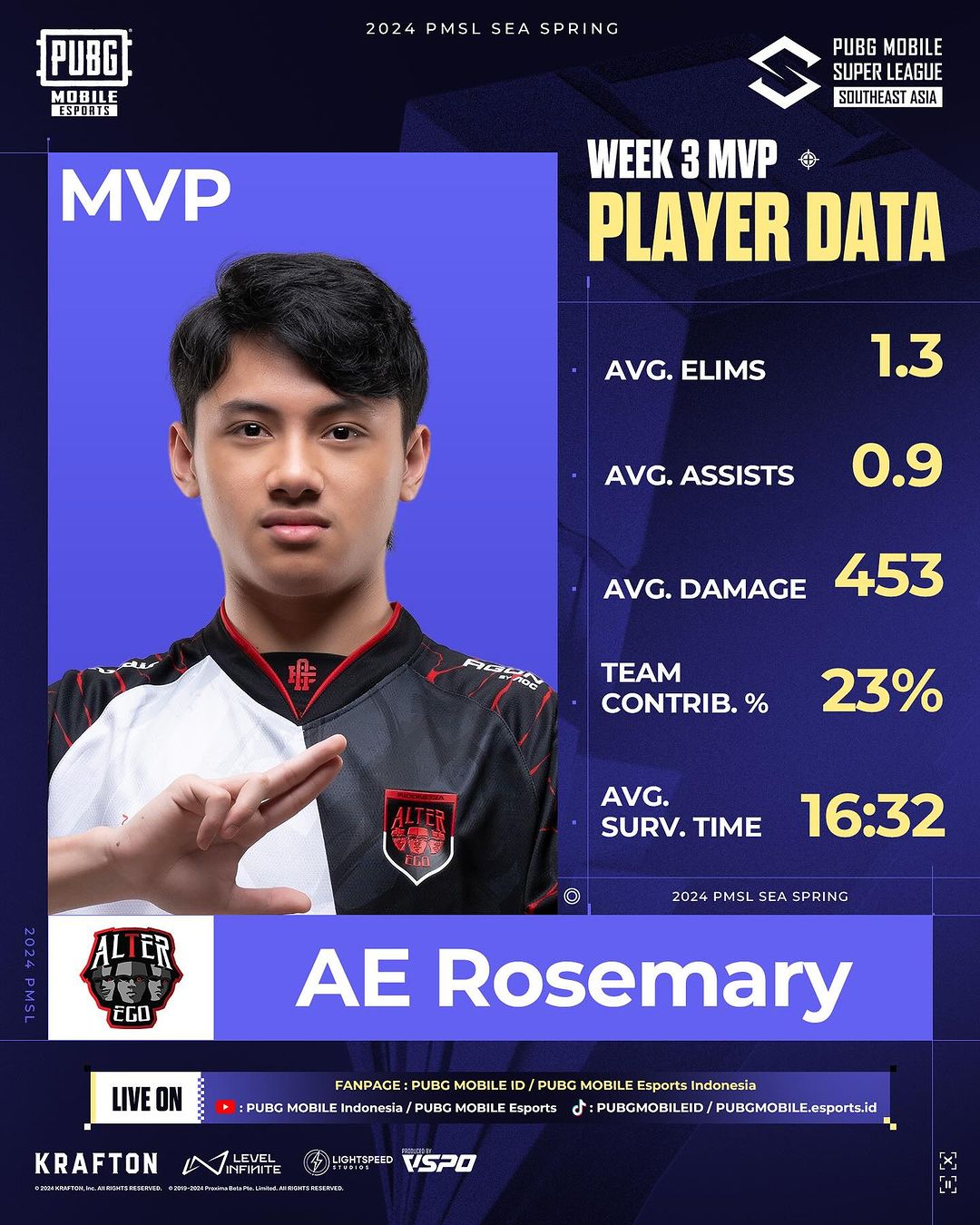 AE Rosemary terpilih menjadi MVP pada Week 3 setelah sebelumnya pada Week 2 ia juga mendapatkan MVP. Sementara pada Week 1 RRQ Snape yang terpilih menjadi MVP. Tentu dengan hal tersebut Player Indonesia mendominasi gelar MVP berturut turut dari pekan pertama hingga pekan ketiga. Hal ini menjadi modal positif menjelang babak Grand Finals, semoga saja semua player Indonesia tetap mampu melanjutkan trend positif ini.