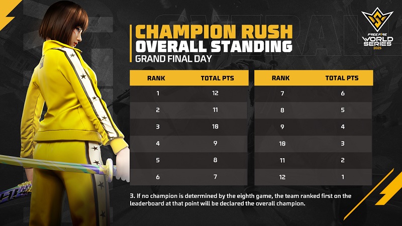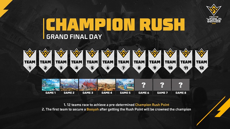 • Champion Rush Point: Di babak Grand Final FFWS Global Finals, tim harus mencapai skor Champion Rush Point untuk menjadi juara. Jika tidak ada tim yang mencapainya hingga game ke-8, tim dengan peringkat tertinggi akan menjadi juara.