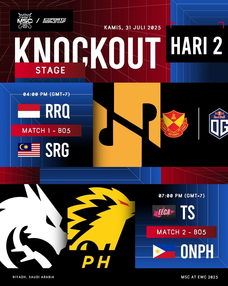 RRQ Hoshi tampil impresif di fase grup MSC 2025 dengan dua kemenangan bersih atas Area 77 dan Aurora Turkiye. Sementara SRG harus melalui jalur lower bracket setelah kalah dari Mythic SEAL, namun bangkit dengan kemenangan atas CFU Gaming.