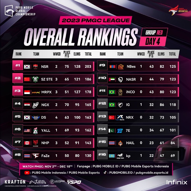 Pada pertandingan Group Red yang berlangsung pada 9-12 November 2023, MRPX berhasil tampil memukau dengan performa mereka, terutama di map Miramar. Konsistensi dalam mengamankan posisi tiga besar selama 4 hari berturut-turut juga menjadi kunci kesuksesan tim yang dianggotai Boboho, Cleon, Pepenk, Rocky, dan Yoru tersebut.