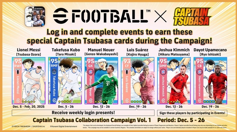 Selama periode kolaborasi, pengguna dapat bermain eFootball dan mendapatkan sejumlah item menarik hanya dengan login serta berpartisipasi dalam event terbaru dimana mereka dapat bermain sebagai karakter dari seri “Captain Tsubasa”.
