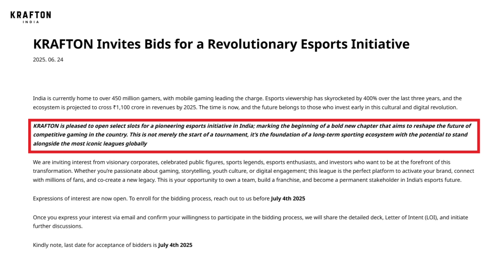 Dalam pengumuman resminya, KRAFTON menyebut bahwa sistem ini bukan sekadar turnamen, melainkan fondasi dari “long-term sporting ecosystem”. Bidding untuk slot franchise akan ditutup pada 4 Juli 2025, dan hanya tim yang berhasil mendapatkan slot yang dapat berpartisipasi dalam liga tersebut.