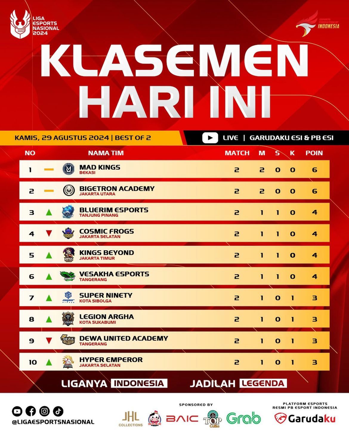 Di klasemen sementara, Mad Kings dari Bekasi tetap kokoh di puncak dengan poin penuh, diikuti oleh Bigetron Academy yang juga mengumpulkan total 6 poin setelah dua hari pertandingan. Persaingan di Liga 2 Esports Nasional 2024 semakin memanas, dengan banyak tim yang berjuang keras untuk mengamankan posisi mereka di papan atas.