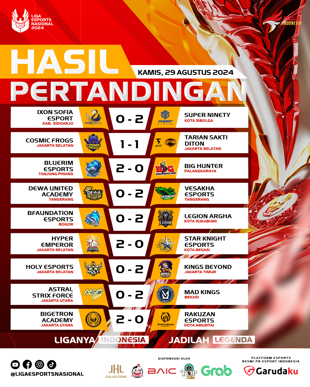 Untuk informasi lebih lanjut mengenai Liga Esports Nasional 2024, kunjungi situs resmi kami di www.garudaku.com atau ikuti akun media sosial kami di @ligaesportsnasional.