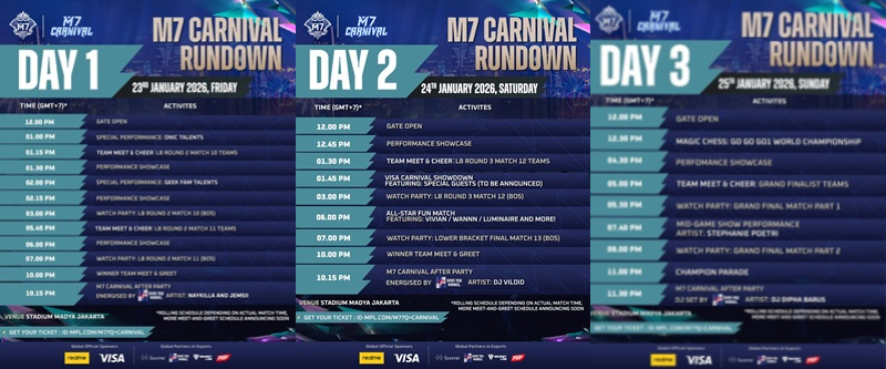 Mobile Legends: Bang Bang (MLBB) kembali mencatat sejarah baru dengan menghadirkan M7 Carnival, festival publik terbesar dalam sejarah turnamen M-Series. Acara spektakuler ini akan digelar selama tiga hari, mulai 23–25 Januari 2026 di Stadion Madya GBK, Jakarta, menghadirkan pengalaman hiburan esports yang belum pernah ada sebelumnya.