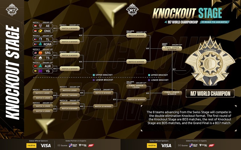 Mulai 18 Januari 2026, delapan tim terbaik akan memasuki fase Knockout Stage. Indonesia kembali menjadi tuan rumah M-Series setelah terakhir kali menggelar M4 pada 2021.