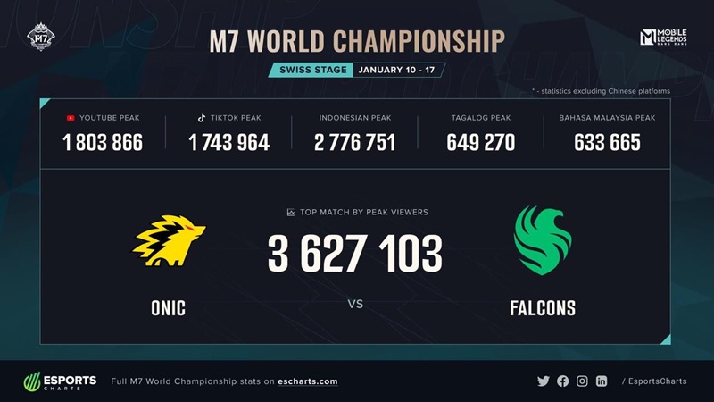 Berdasarkan data dari Esports Charts, Swiss Stage M7 berhasil mencapai peak concurrent viewers (PCV) sebanyak 3.627.103 penonton online. Angka luar biasa ini tercatat saat laga sengit antara wakil tuan rumah ONIC ID melawan Team Falcons.