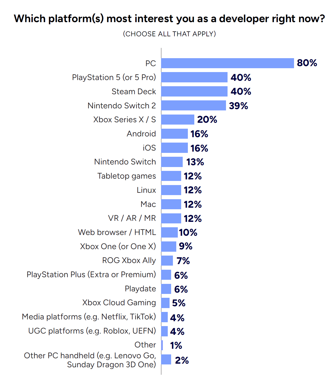 Dominasi PC menunjukkan bahwa meskipun konsol tetap menjadi pilar penting, platform komputer pribadi masih menjadi prioritas utama bagi pengembang gim kelas AAA maupun independen. Namun, sorotan utama tertuju pada persaingan di pasar konsol generasi saat ini dan masa depan. Hasil survei mencatat bahwa PlayStation 5 (PS5) dan Nintendo Switch 2 menarik minat yang hampir serupa di kalangan pengembang, dengan masing-masing mengantongi persentase ketertarikan sebesar 40 persen dan 39 persen.