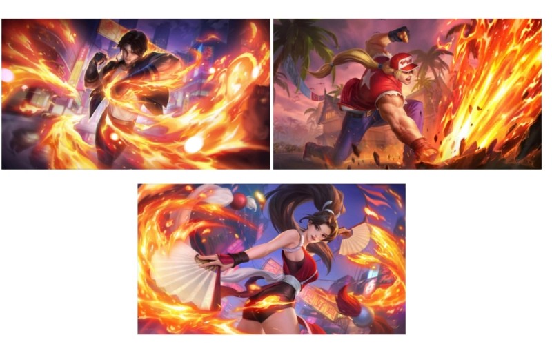 Tiga hero ikonis MLBB yang mendapatkan skin kolaborasi dengan KOF ‘97 yaitu Masha (Mai Shiranui), Paquito (Terry Bogard), dan Valir (Kyo Kusanagi). Skin hero tersebut akan menampilkan efek-efek spesial khas karakter KOF ‘97 saat bertempur di Land of Dawn, seperti skill, elimination, recall, dan respawn. Termasuk juga border avatar dinamis dan emote kolaborasi baru, yang membuat pengalaman bermain jadi semakin seru.