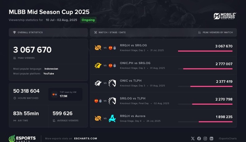 Mid Season Cup (MSC) 2025 berhasil mencetak sejarah sebagai turnamen Mobile Legends: Bang Bang (MLBB) paling banyak ditonton dalam sejarah Esports World Cup (EWC). Berdasarkan data dari Esports Charts, MSC 2025 mencatat 3.067.670 Peak Concurrent Viewers (PCV), 50.318.603 jam tontonan, dan 599.626 rata-rata penonton serentak (ACV). Angka ini menegaskan posisi MLBB sebagai salah satu esports mobile paling populer secara global.