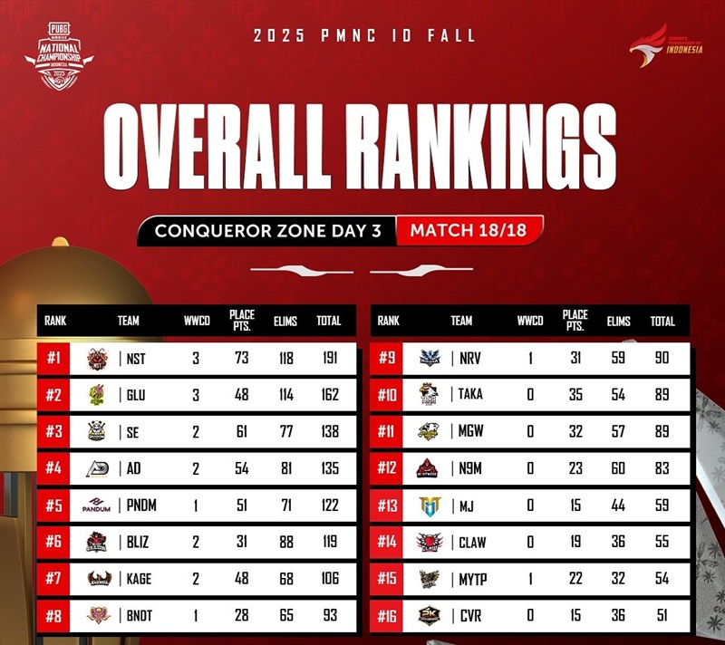 Ratusan tim amatir dan semi-pro dari seluruh Indonesia telah mengikuti proses kualifikasi panjang, hingga tersaring menjadi 16 tim terbaik yang bertanding di babak Conqueror Zone pada 15–17 Agustus 2025. Dalam total 18 match, NST Genoth tampil dominan dengan 191 poin dan 3 WWCD, unggul jauh dari GLU BLUG yang menempati posisi kedua.