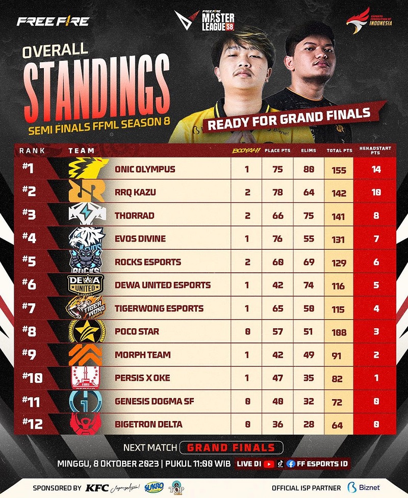 Apalagi ONIC Olympus yang walaupun tak menorehkan Booyah, namun rata-rata finish konsisten di 5 besar. Belum lagi asupan eliminasi mereka juga tinggi, terbanyak saat ini di fase semi final dengan 80 total elims. Performa ini mengantar Sang Landak ke peringkat pertama standing sementara dan akan mendapat head start point di fase final sebanyak 14 point. RRQ Kazu dibawahnya akan mendapat poin awalan sebanyak 10 poin.