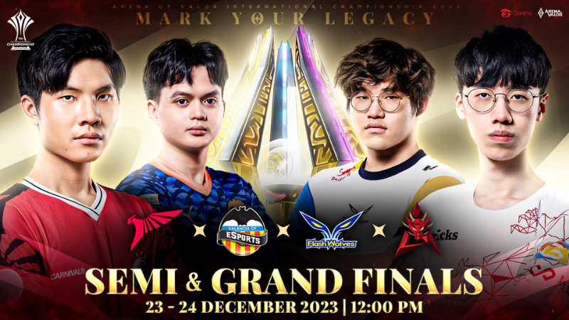 Setelah melalui pertarungan sengit babak Group Stage dan Quarter Finals selama 12 hari, empat tim siap bertarung di laga puncak Arena of Valor International Championship (AIC) 2023. Siap digelar pada 23-24 Desember 2023, laga Semifinals dan Grand Finals akan menjadi momentum lahirnya sang lahirnya juara AIC 2023 yang akan membawa pulang hadiah terbesar dari prize pool US$500.000.