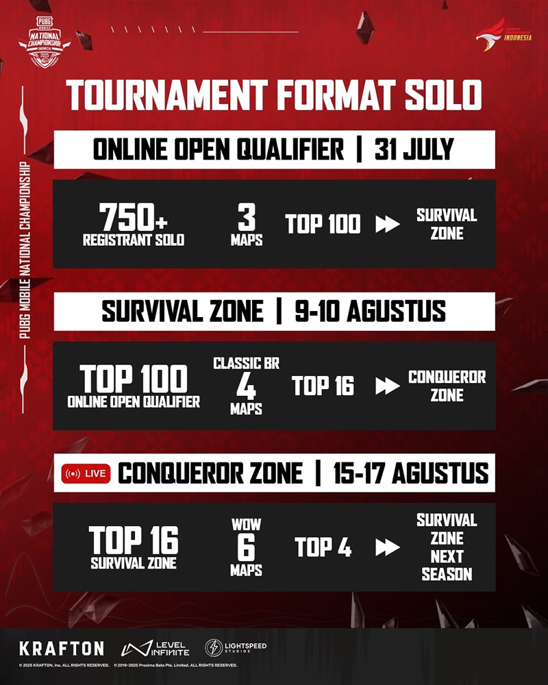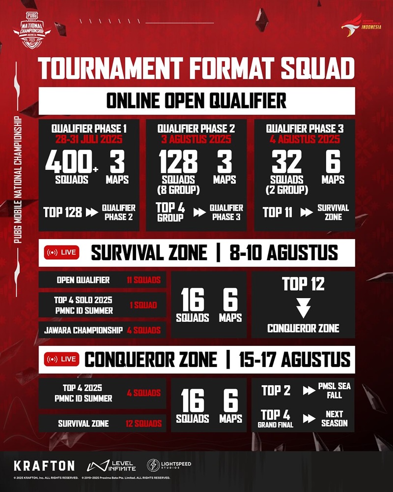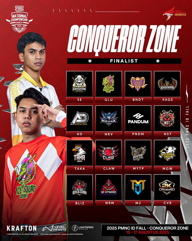 Setelah melewati empat tahap kualifikasi (Kualifikasi 1, 2, 3, dan Survival Zone), kini tersisa 16 tim Squad dan 16 pemain Solo yang akan bertarung di babak Conqueror Zone pada 15–17 Agustus 2025.