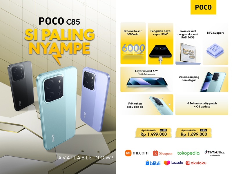POCO C85 tersedia mulai 9 September 2025 pukul 12.00 WIB di Mi.com, Shopee, Tokopedia, TikTok Shop, Blibli, Lazada, dan Akulaku.