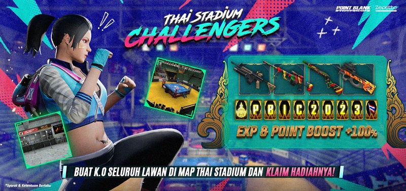 Map Thai Stadium yang baru dirilis ini merupakan map yang ditujukan untuk mode permainan Deathmatch. Selama masa perkenalan map tersebut, Troopers akan disambut in-game event Thai Stadium Challengers. Troopers bisa mendapatkan tambahan EXP dan Point 100% apabila bermain di map yang menyerupai ring tinju olahraga bela diri tersebut. Tentunya, event Thai Staidium Challengers akan sangat membantu Troopers yang ingin mencapai level lebih tinggi dalam permainan Point Blank.