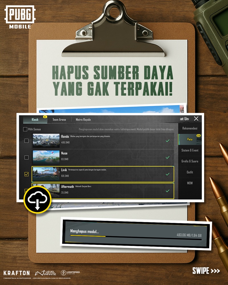 Tidak semua sumber daya tersebut selalu digunakan. Kini, PUBG MOBILE memberikan kemudahan bagi pemain untuk menghapus file yang tidak diperlukan secara langsung di dalam game.